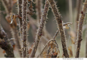 Nos églantiers sont devenus énormes et les vielles branches sèches sont légion mais il me faut les approcher avec circonspection. En effet tous les rameaux des plus fins aux plus épais sont hérissés d’aiguillons crochus et piquants.