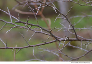 Les épines peuvent porter fleurs et feuilles. On voit bien sur cette photographie du piquant groseillier à maquereaux (Ribes uva-crispa) que chaque épine forme la base d’un bourgeon de feuille, prêt pour le printemps proche.