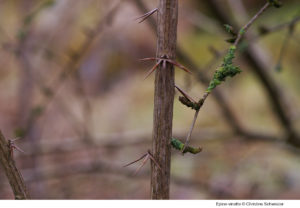 Les épines sont des organes transformés en pointes dures et piquantes, comme chez le prunellier (Prunus spinosa), ce petit arbuste hérissé d’épines sombres, effilées et orientés en tous sens. Sa silhouette noirâtre et spinescente lui a valu le surnom d’épine-noire.