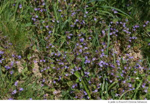 Sa fleur est d’un beau mauve violacé, avec une corolle bilabiée au bout d’un long tube. Sur ses lèvres de minuscules taches pourpres sont autant de guides visuels pour les pollinisateurs qui convoitent le nectar logé au fond du tube. Ce sont essentiellement les abeilles sauvages, les bourdons et les bombyles, ces mouches velues avec une longue trompe, qui arrivent à atteindre cette manne sucrée.